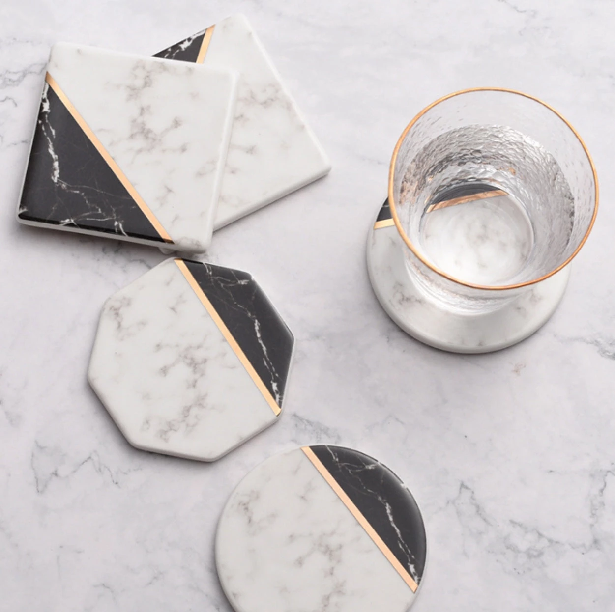 Coasters play an important role in protecting your expensive furniture from scratches and stains. But did you know that they can be used as a style statement too? Well, our Black and White Marble Pattern Coasters scream elegance and class, and are sure to let the world know of your exquisite tastes. Featuring a unique marble finish, these black and white coasters come in  sets of four. They can instantly enhance the look of all kinds of table tops, whether glass, marble or plain wood. What’s more, you get three shapes to choose from- square, hexagon and circle.Â