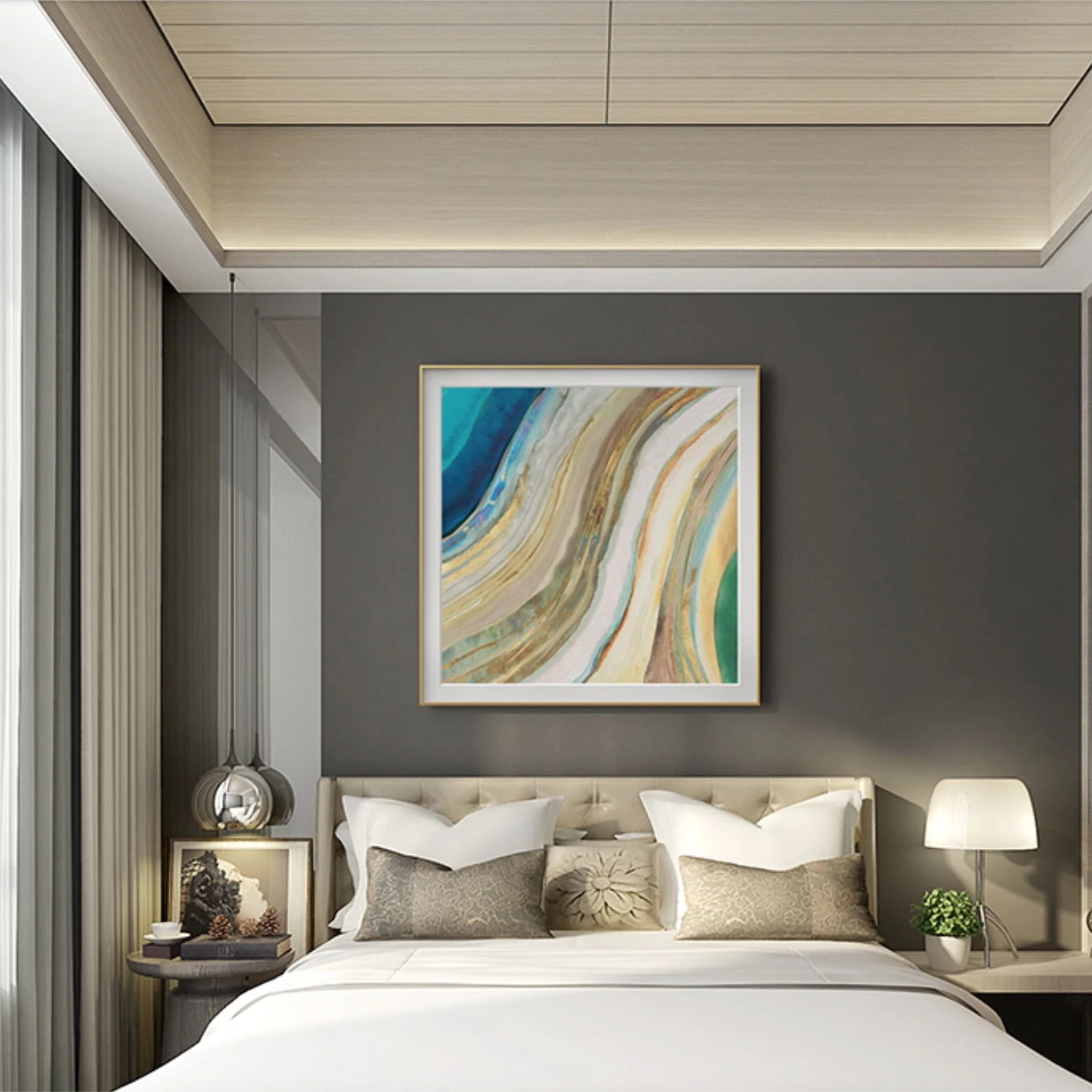 Want to give your space a cool, chic yet earthy update? Install this Framed Gold and Blue Agate Art Print onto a blank wall and watch it give life and color to a dull space. This canvas print comes with a brushed metal frame and Plexiglass screen. Expect its gorgeous swirls, jewel tones, and hippie vibe to give any room in your home an instant mood boost. Metal frame is available in gold, silver and black. Available in seven different sizes and arrives ready to hang.Â