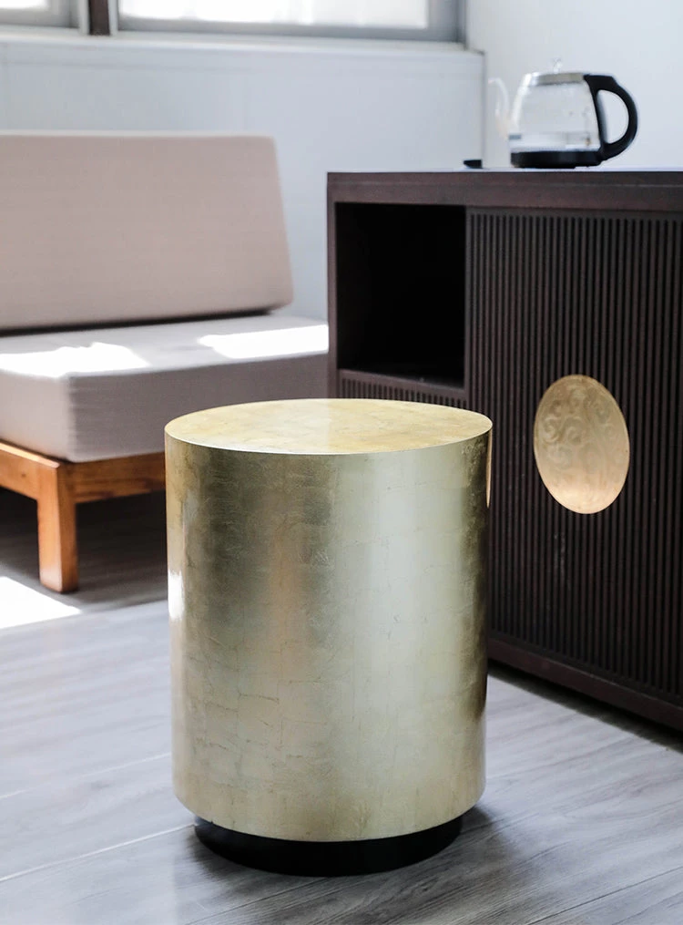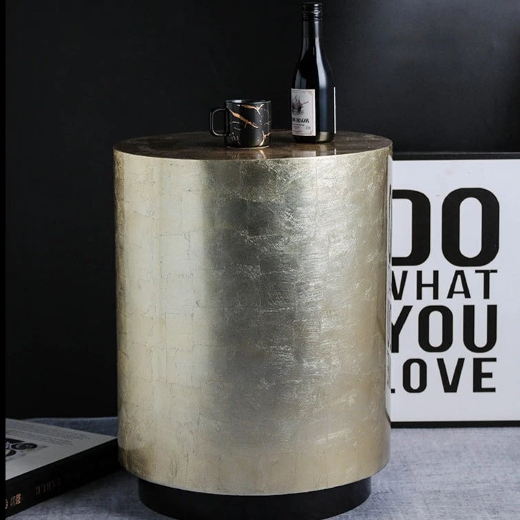Place this Modern Gold Drum Side Table anywhere a striking focal point is needed. This statement piece illuminates the space while also working as a convenient display for your quirky accents or as a coffee table. This drum-shaped table is glam thanks to its handcrafted gold leaf finish. It draws attention to a corner or serves as a stunning piece for a sofa or armchair. It will complement a modern home decor and will last for a long time.