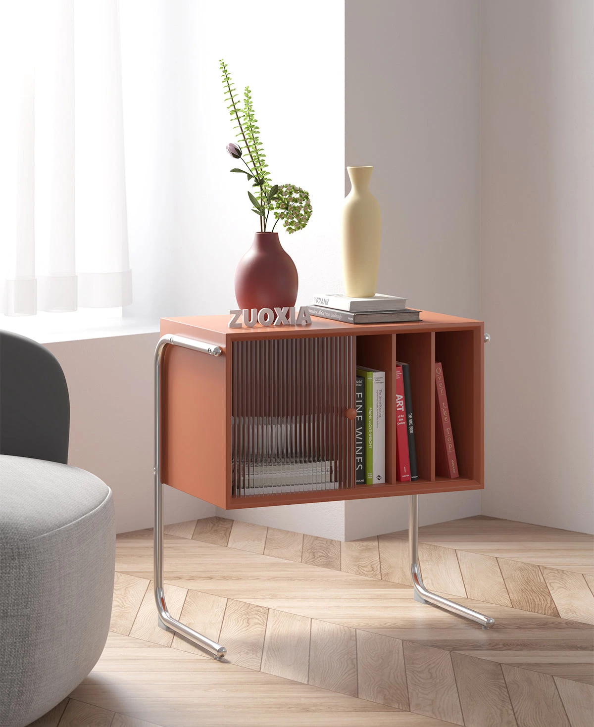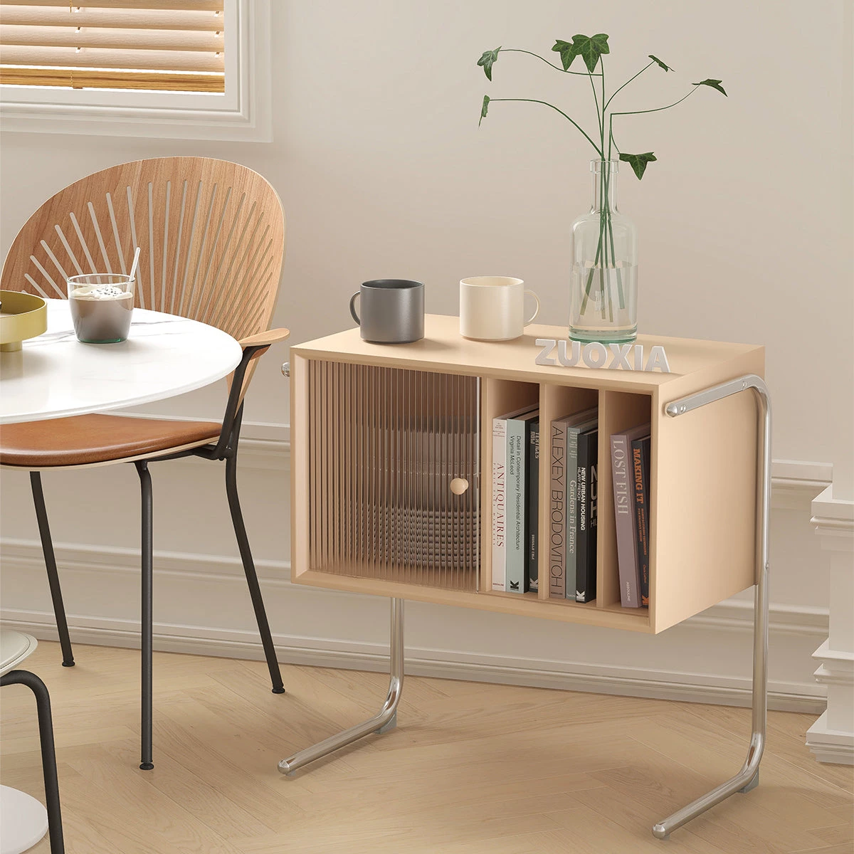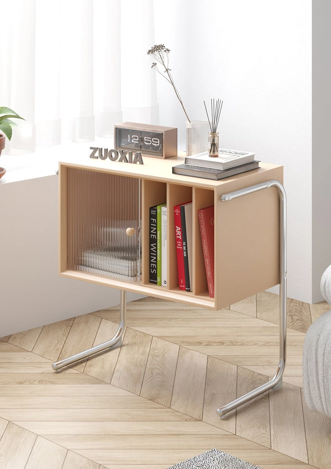 This modern looking side table cabinet looks beautiful and is perfect to showcase your favorite vinyl records and store books. Features a sliding door with a rippled glass panel and floating shelves mounted on metal legs. This Nico coffee end bookcase is available in maple, beige and white color. It will suit a Nordic homestyle.Â