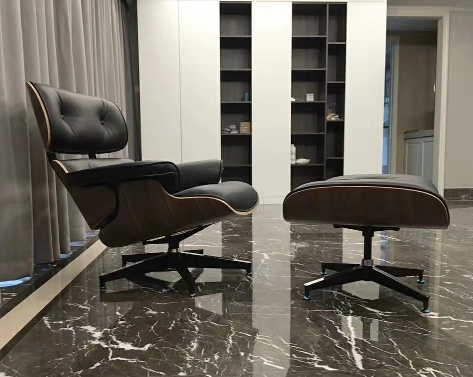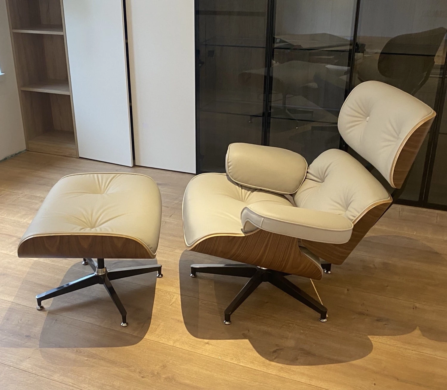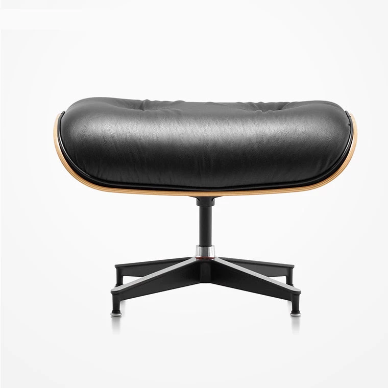 - Materials: Napa leather upholstery, curved plywood shells with a seven-ply wood grain finish, high density memory foam seat, die-cast aluminium swivel base