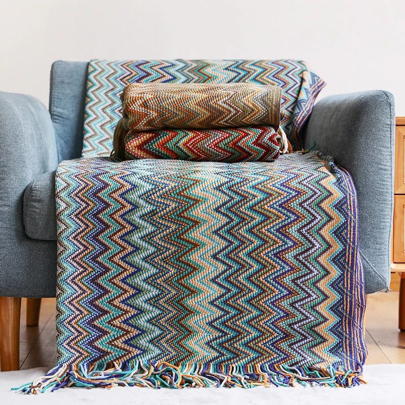 Let the charming weave of this Colorful Crochet Chevron Throw Blanket add a splash of color and a sense of movement to your space. Perfect for minimalist spaces and for neutral-colored homes, this vibrant patterned throw blanket instantly livens up an otherwise dull and overly clean or streamlined area. This chevron throw blanket would make a cheerful companion for your grey or beige couch or for your white bed linens. You can also use this throw blanket to give a lifeless home office a chic update.