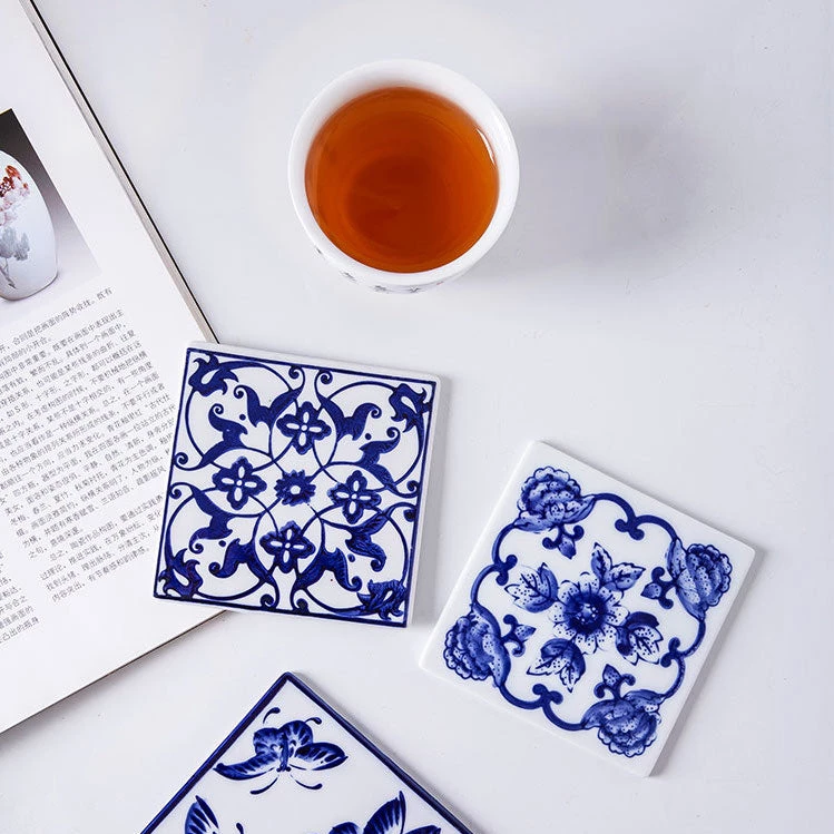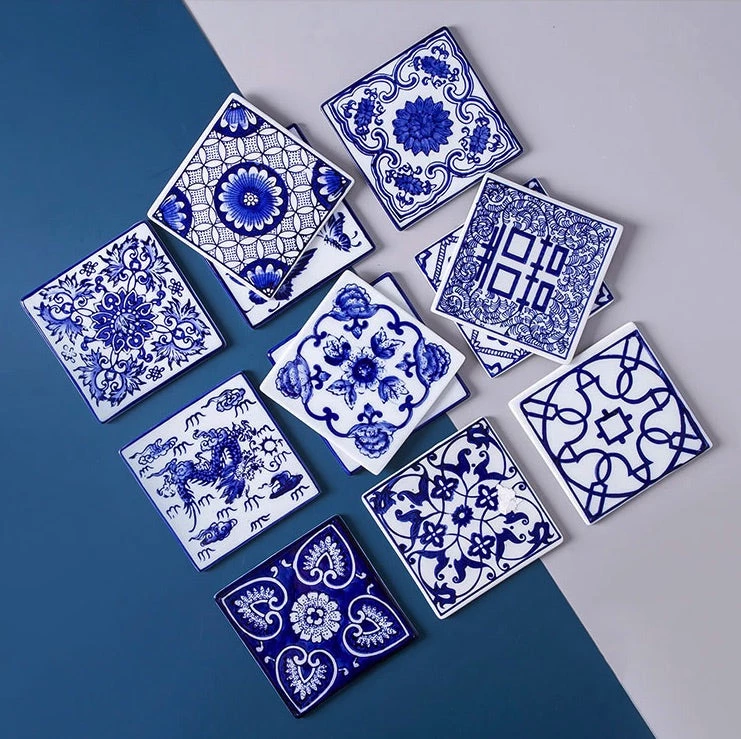 - Includes: Mixed set of 6 different blue and white coasters
