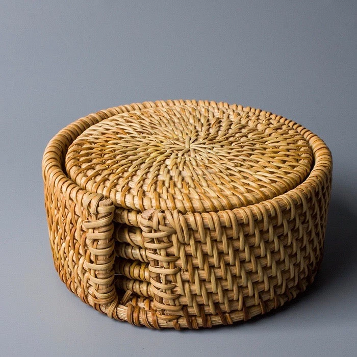 Love rattan but not sure how to introduce it at home? Start small and simple with these rattan coasters. Included in this set are six woven rattan coasters and a matching holder. A chic addition to your table setting supplies, these coasters exudes warmth and would make the perfect coasters to use when hosting a summer party indoors or outdoors. Stylish, easy to maintain, and easy to mix and match, these rustic, exotic and earthy rattan coasters will add interest to any tablescape. Available in two sizes.