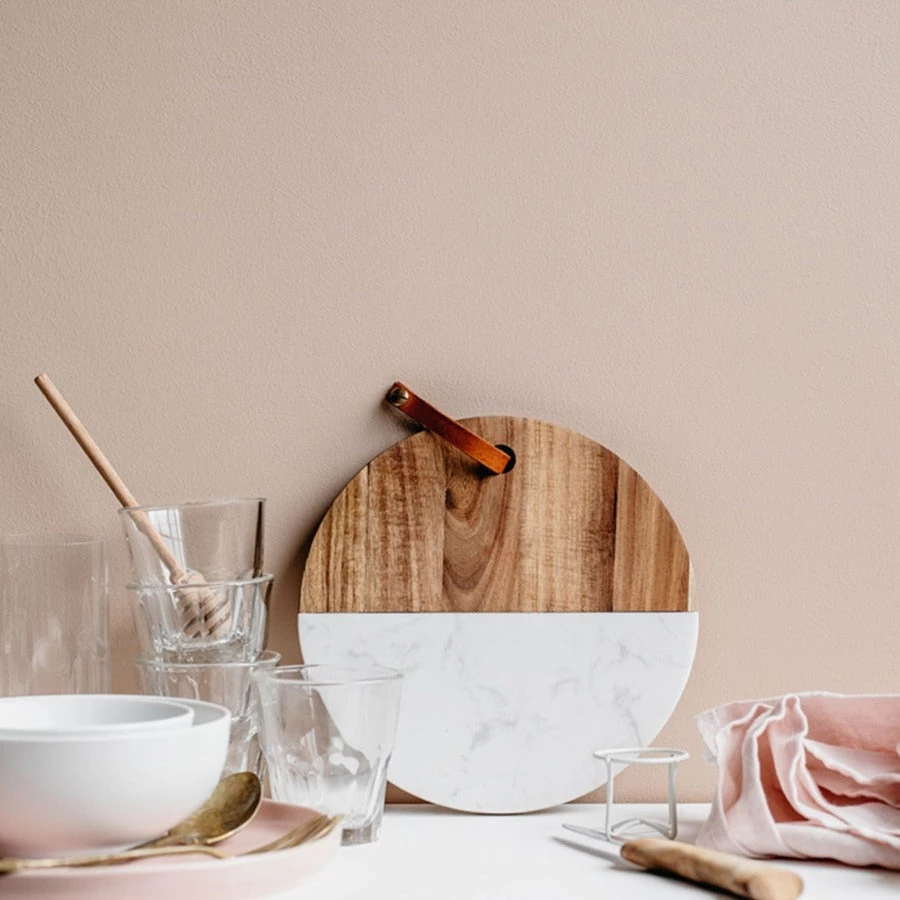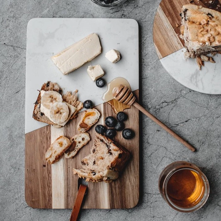 This beautiful serving board combines two or our all time favorite materials: marble and wood. And they compliment each other beautifully. As marble and wood are natural materials, each piece is also unique. They make for stunning serving dishes for cheese and fruit platters or bread boards.