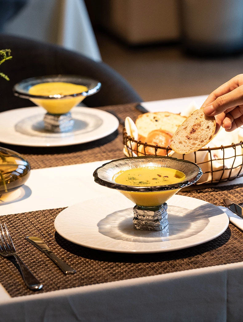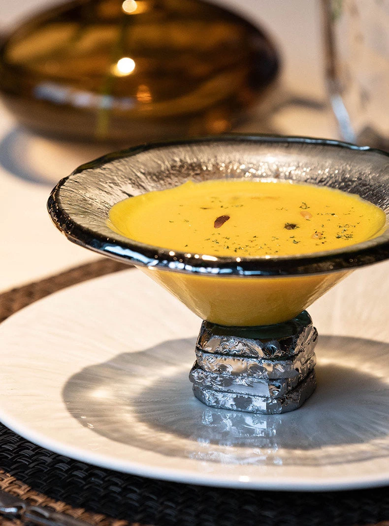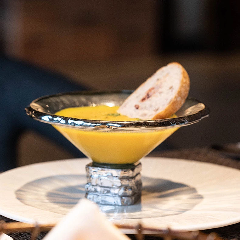 This Metal and Glass Dessert Bowl is elegantly designed and perfect for dips, nuts, olives, dessert or ice-cream. Available in a set of 4, this 15cm wide serving bowl is handmade with glass decorated with metal electroplated on the edge of the bowl and the stem. This beautifully designed bowl is great for entertainment and as a gift.