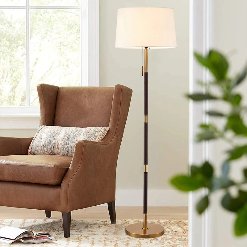 - Features: Gold lamp base with brown genuine leather or Silver lamp base with black genuine leather, Handmade fabric lampshade in white or linen color, Foot switch