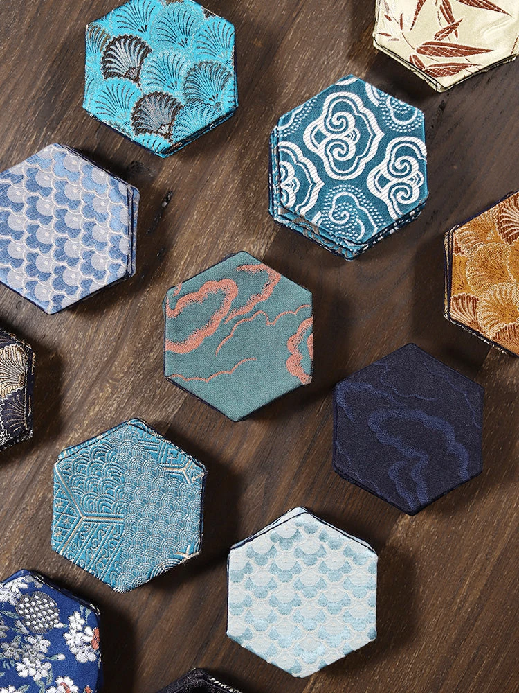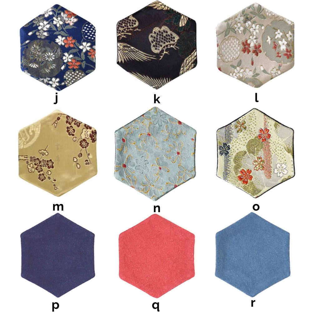 These distinctive hexagon Oriental Silk Coasters will add a touch of Oriental beauty to your decor. With these stunning designs on jacquard fabric, you can entertain in style for any occasion while protecting your furnishings. The set includes six lovely coasters of your choice. Available in 18 different styles and colors. These coasters are also terrific gift ideas.