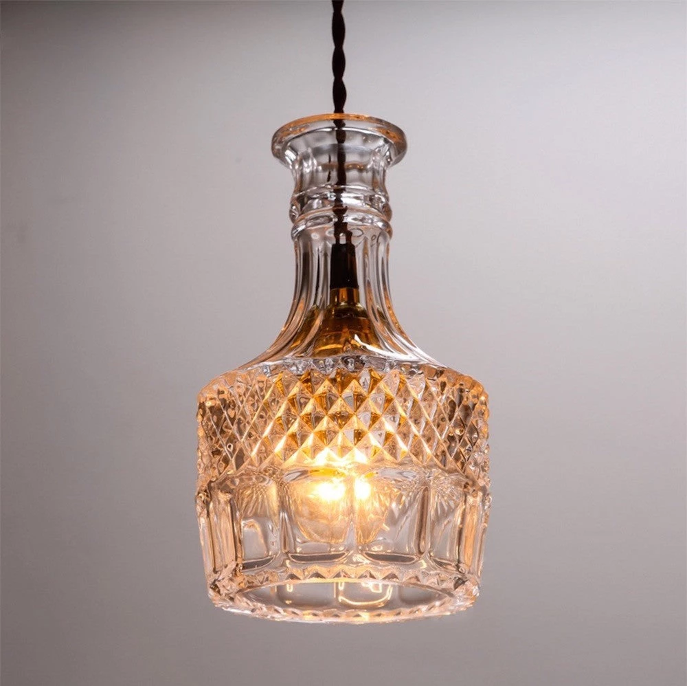 This beautiful, quirky pendant light takes the form of a vintage liquor bottle. The bottle shape, sparkle of cut class, and retro material hanging cord make a fun and elegant addition to living spaces such as an open kitchen, bar or dining area. Available in clear or frosted glass and as single pendants or a cluster of three.