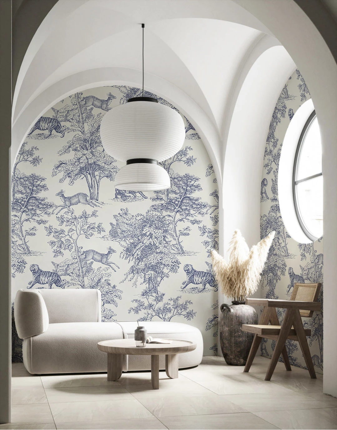 French Blue is a lovely smokey grey blue. This shade of blue has stood the test of time. To exude a fresh and bright feeling, pair it with colors such as geranium pink, yellow, or daisy orange. Our French Blue Forest Wallpaper with animal and forest illustrations can be used anywhere, but it’s especially nice as a feature wall in the living room, bedroom, or home office. This wallpaper is available in four different color schemes, each of which is made up of a careful balance of subdued colours and subtle tones. Here’s our suggestion: choose one wall in your living area and make a statement piece of this stunning wall mural. Deciding how much you need is easy – just follow the instructions below and we’ll custom size to your wall and ship it free worldwide.