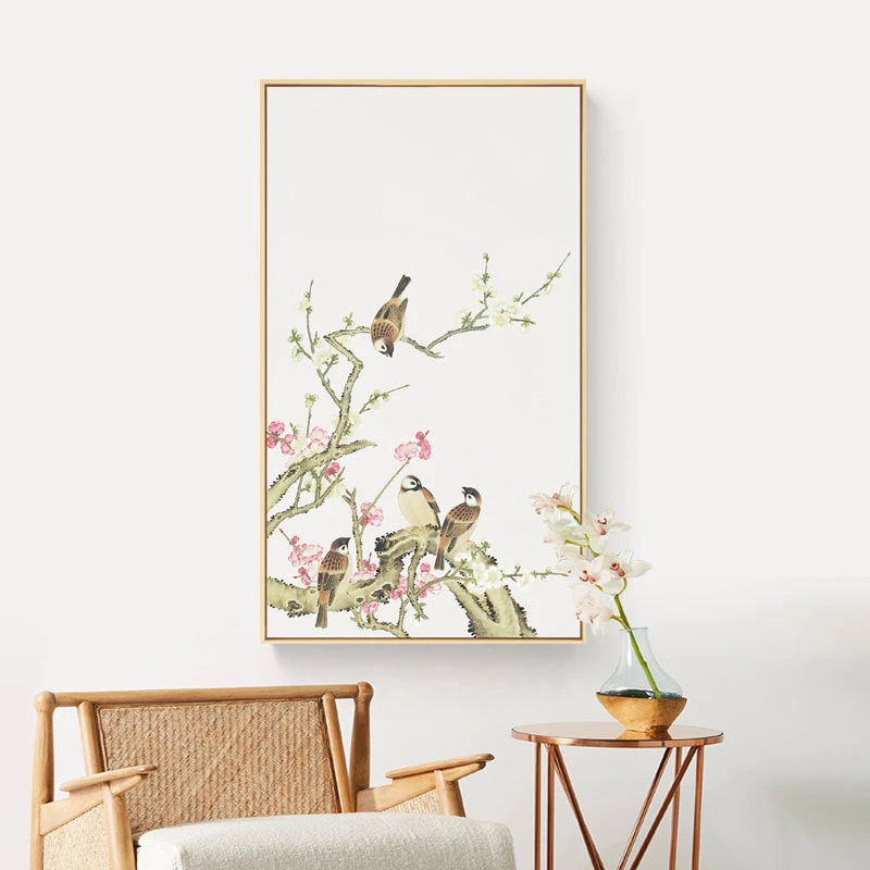 The Oriental Birds picture is a piece of marvellous artwork. We love the beautiful birds on the branches with flowers that are picturised on a white background. This durable art is printed on a high-quality canvas framed using the natural wood floating frame. We love to use it in the master bedroom, study room, home office, or the living room to enhance its elegance. It makes us experience real nature through this artwork. It is available in four styles that come in three sizes. We ship the product worldwide and deliver it for free in Hong Kong.