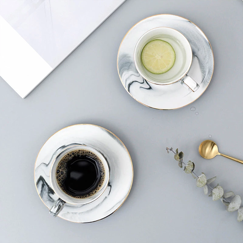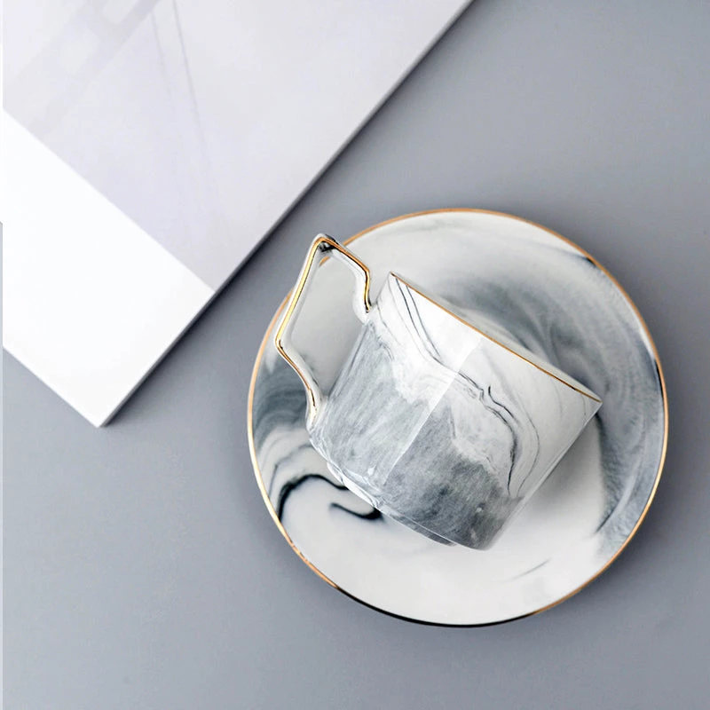 Impressing your guests just turned super easy with our White Marble Tea Cup and Saucer set. Featuring an impressive contemporary design, this set has been made from finest quality ceramic with a luxurious marble finish and gold trims. Owing to its classy appearance and effortless charm, this set is sure to be the star attraction at all those cozy tea parties with your loved ones. It is easy to care for too, just hand wash it and wipe it clean.